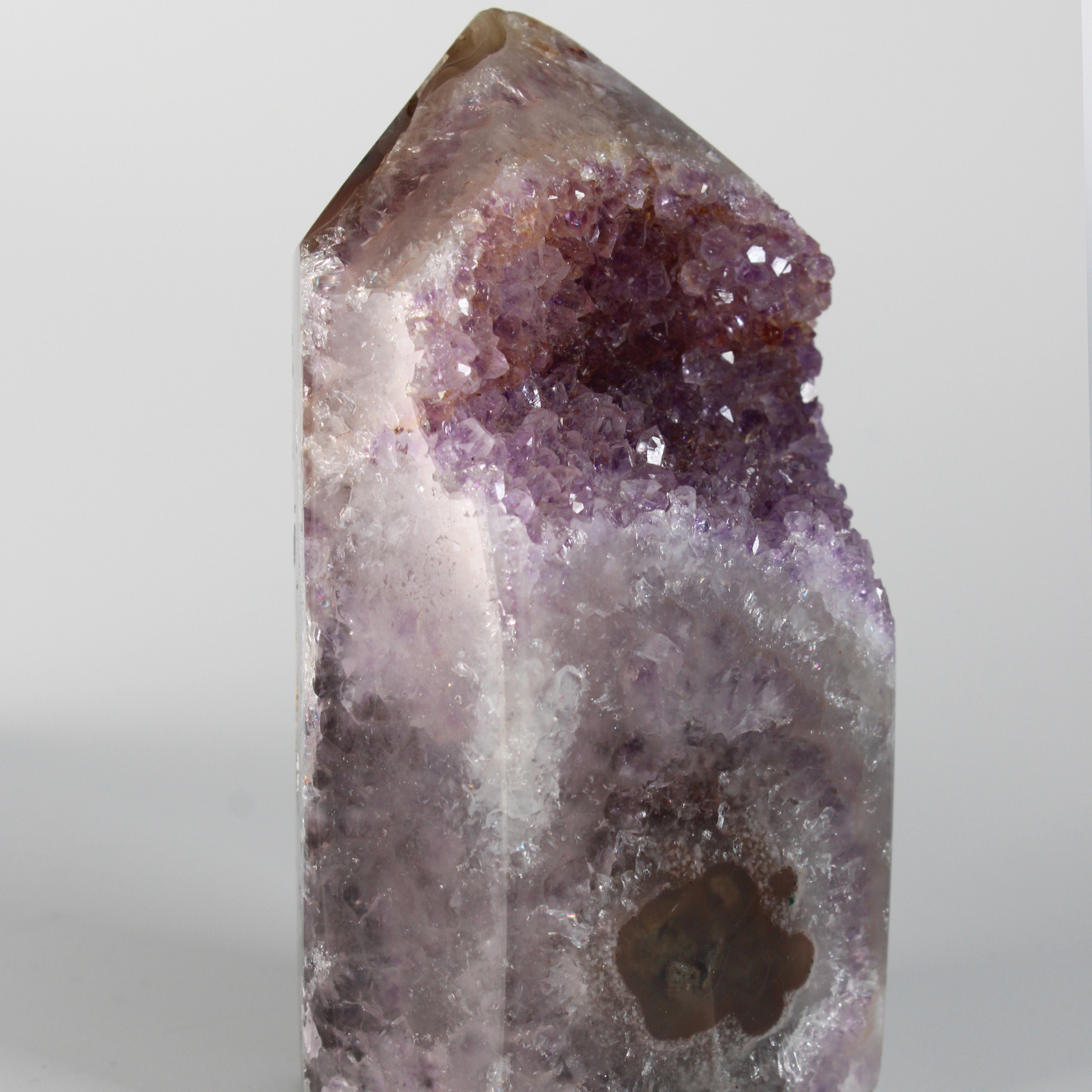 De amethist cluster punt werkt sterk op het kruinchakra en het derde oog en ondersteunt bij het tot rust brengen van de geest, het loslaten van spanning en het versterken van intuïtieve inzichten. Door de puntvorm wordt energie gebundeld en gericht, wat deze steen bijzonder geschikt maakt voor meditatie, energetisch werk, intenties zetten en het zuiveren en beschermen van ruimtes.