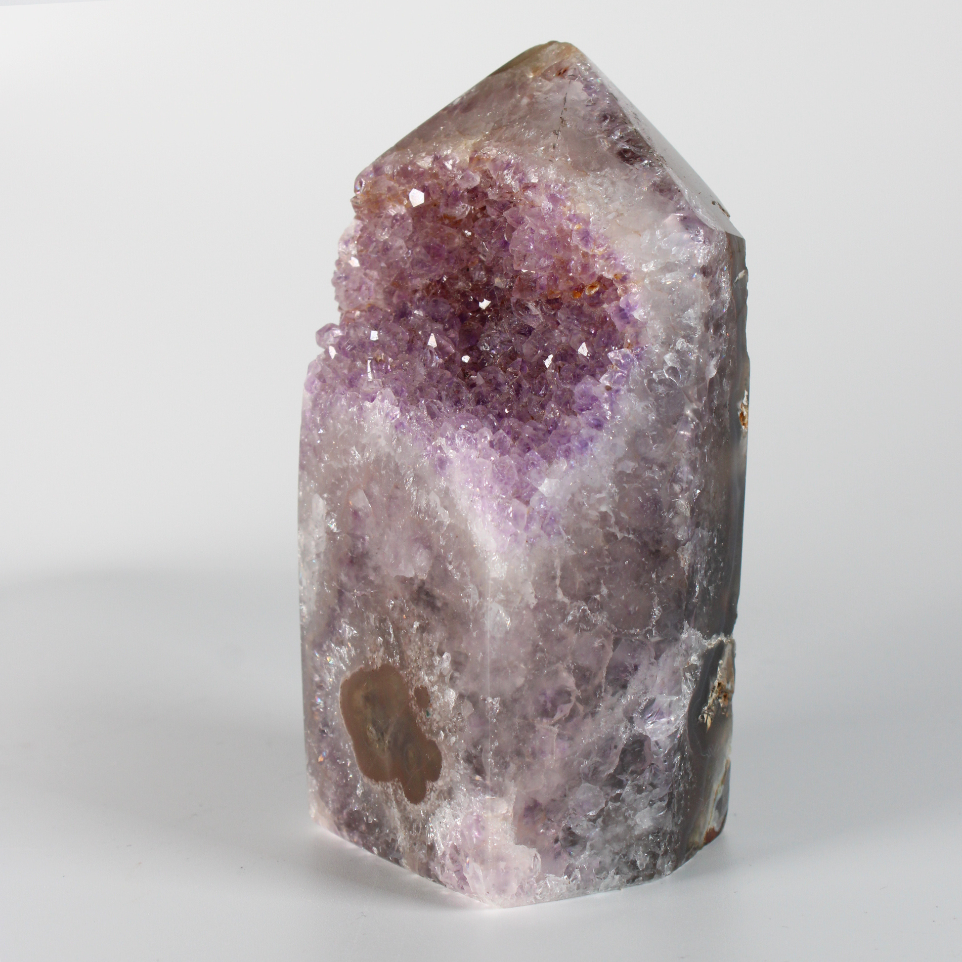 Deze indrukwekkende Amethist Cluster Punt met Stalactiet en Agaat is een krachtig en zeldzaam natuurstuk waarin meerdere aardse en spirituele energieën samenkomen. De combinatie van zuiverende amethist, transformerende stalactietvorming en beschermende agaat zorgt voor een diepe balans tussen spirituele verdieping en stevige aarding.