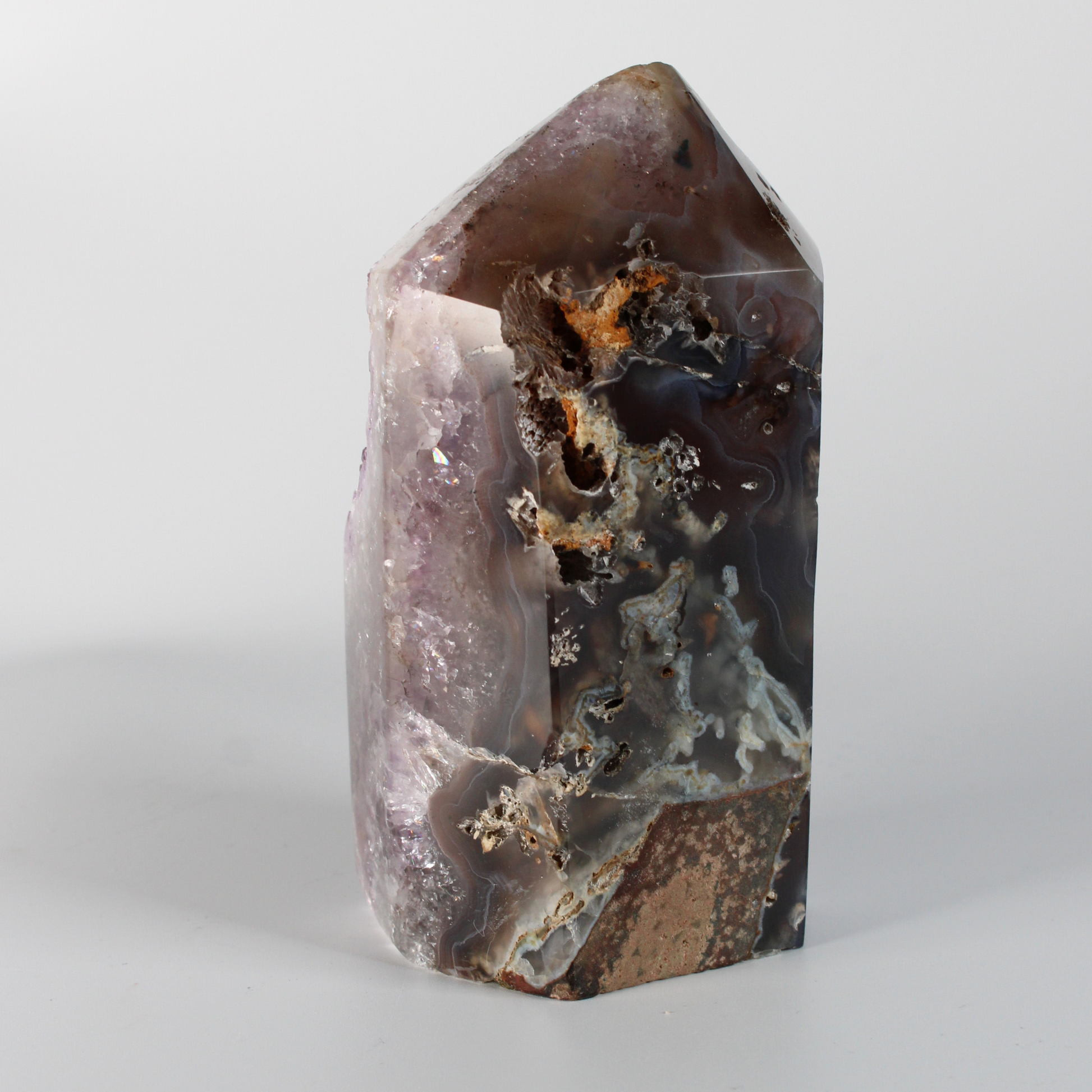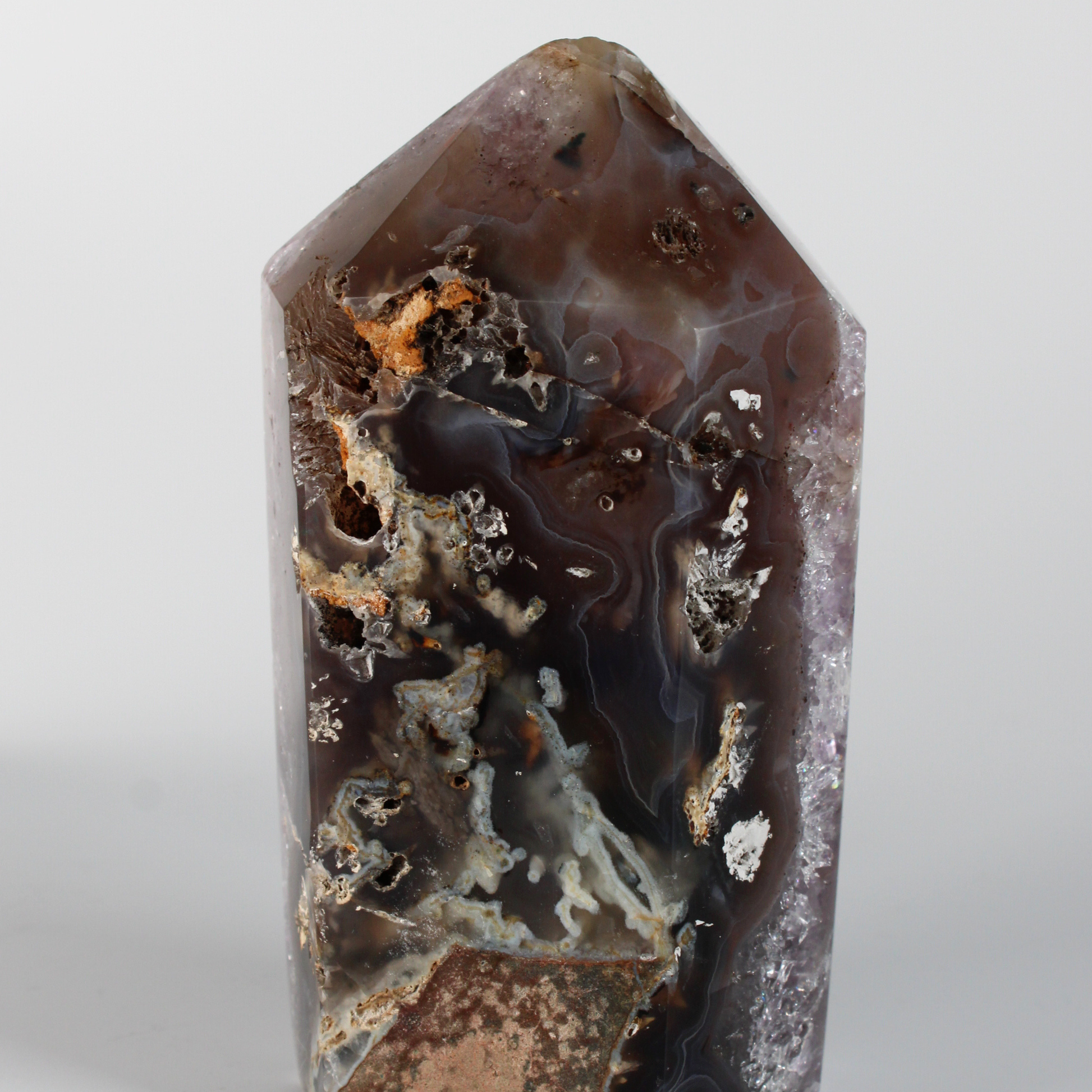Aan de achterkant is agaat zichtbaar, een steen die bekendstaat om zijn beschermende en aardende werking. Agaat brengt stabiliteit, emotionele rust en een gevoel van veiligheid en helpt om spirituele inzichten te integreren in het dagelijks leven. Samen met amethist zorgt agaat voor een harmonieuze balans tussen hemel en aarde.