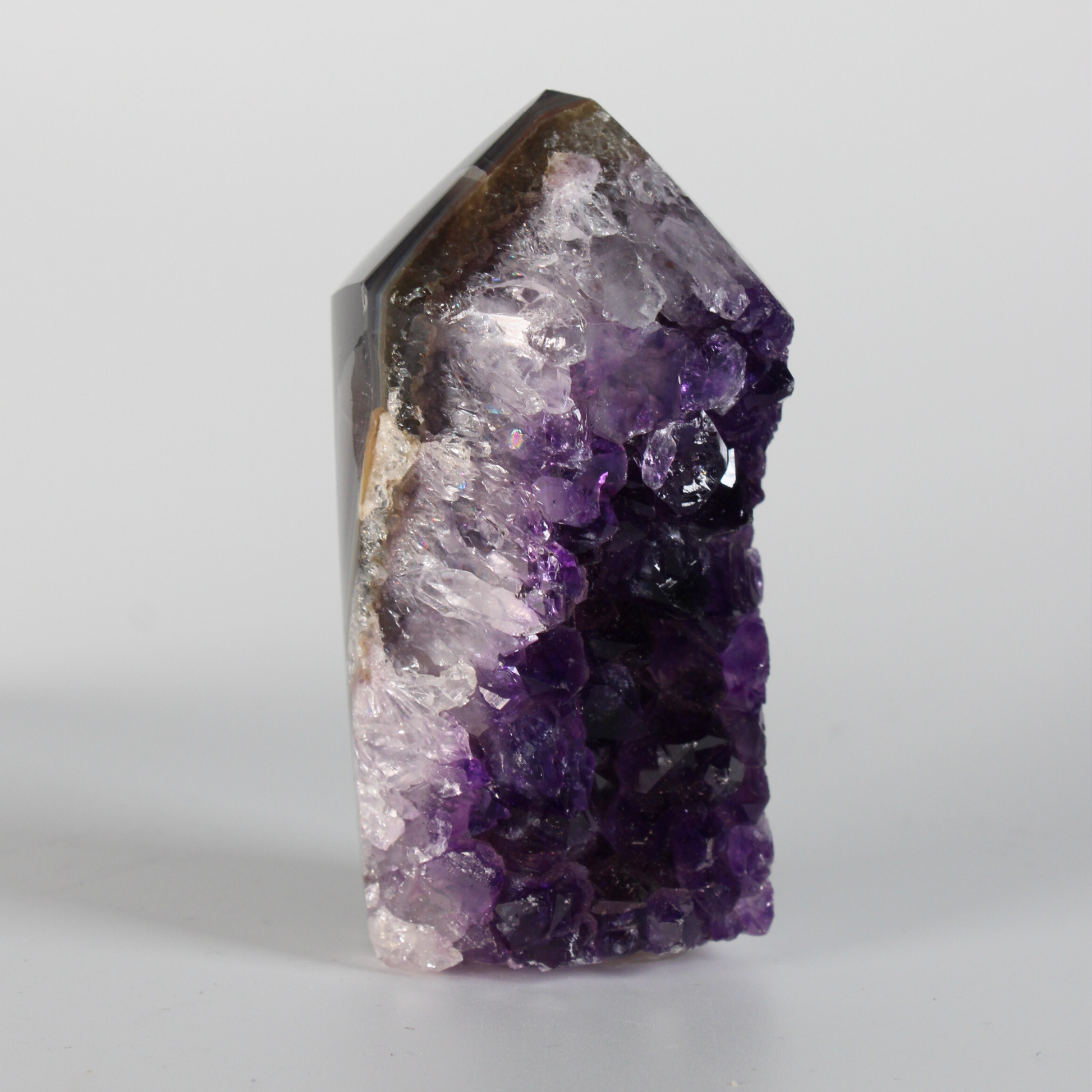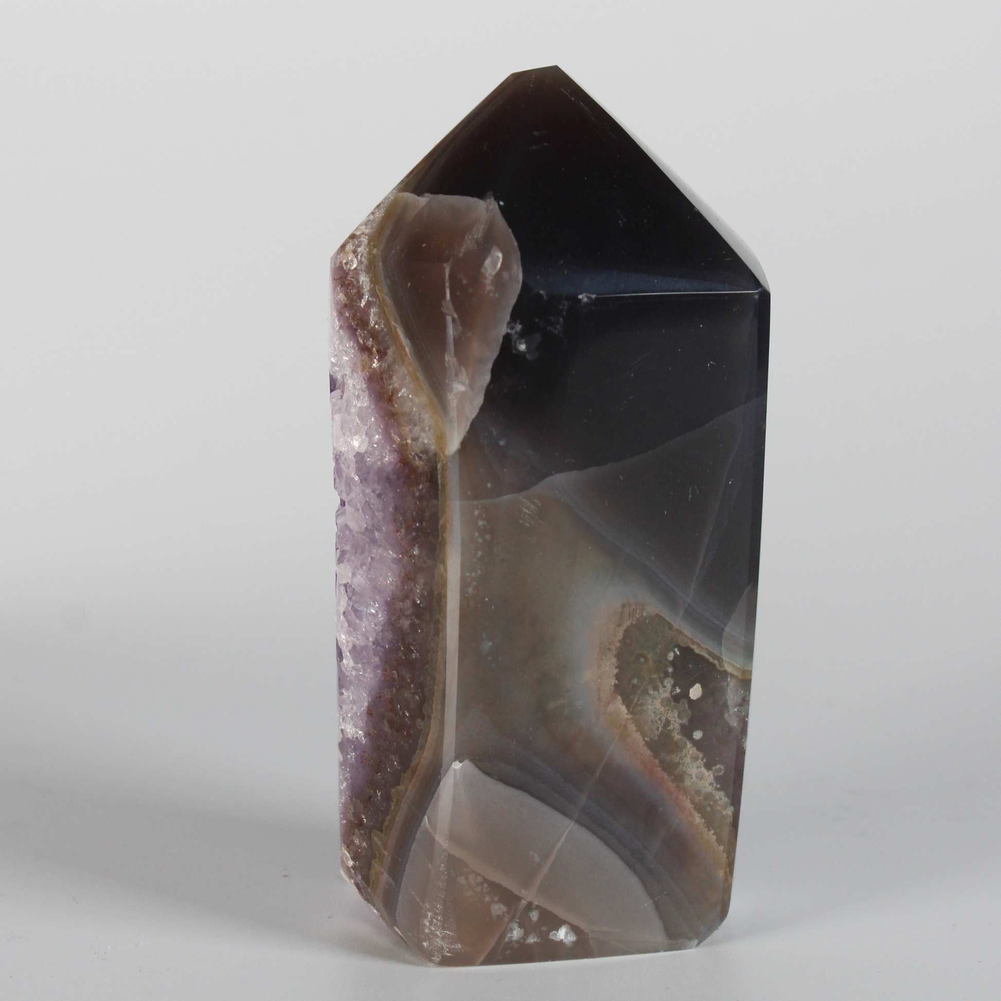 Deze prachtige Amethist Cluster Punt met Agaat Achterkant combineert de hoge, zuiverende energie van amethist met de stabiliserende en beschermende kracht van agaat. Samen creëren zij een harmonieuze balans tussen spirituele verdieping en aarding, waardoor deze steen zowel rust brengt in de geest als stevigheid geeft op emotioneel en energetisch niveau.