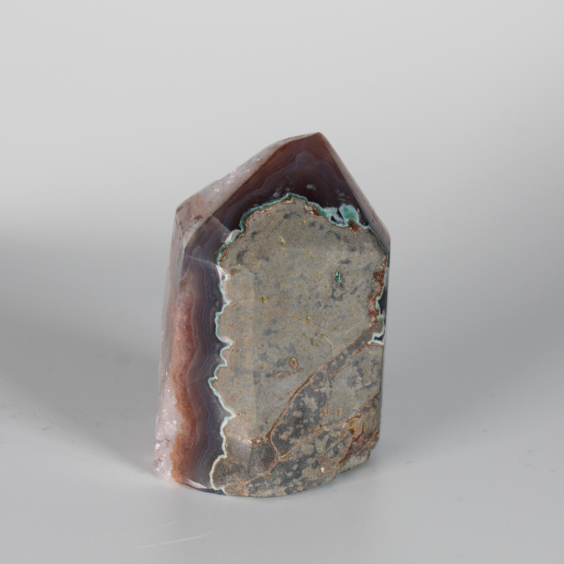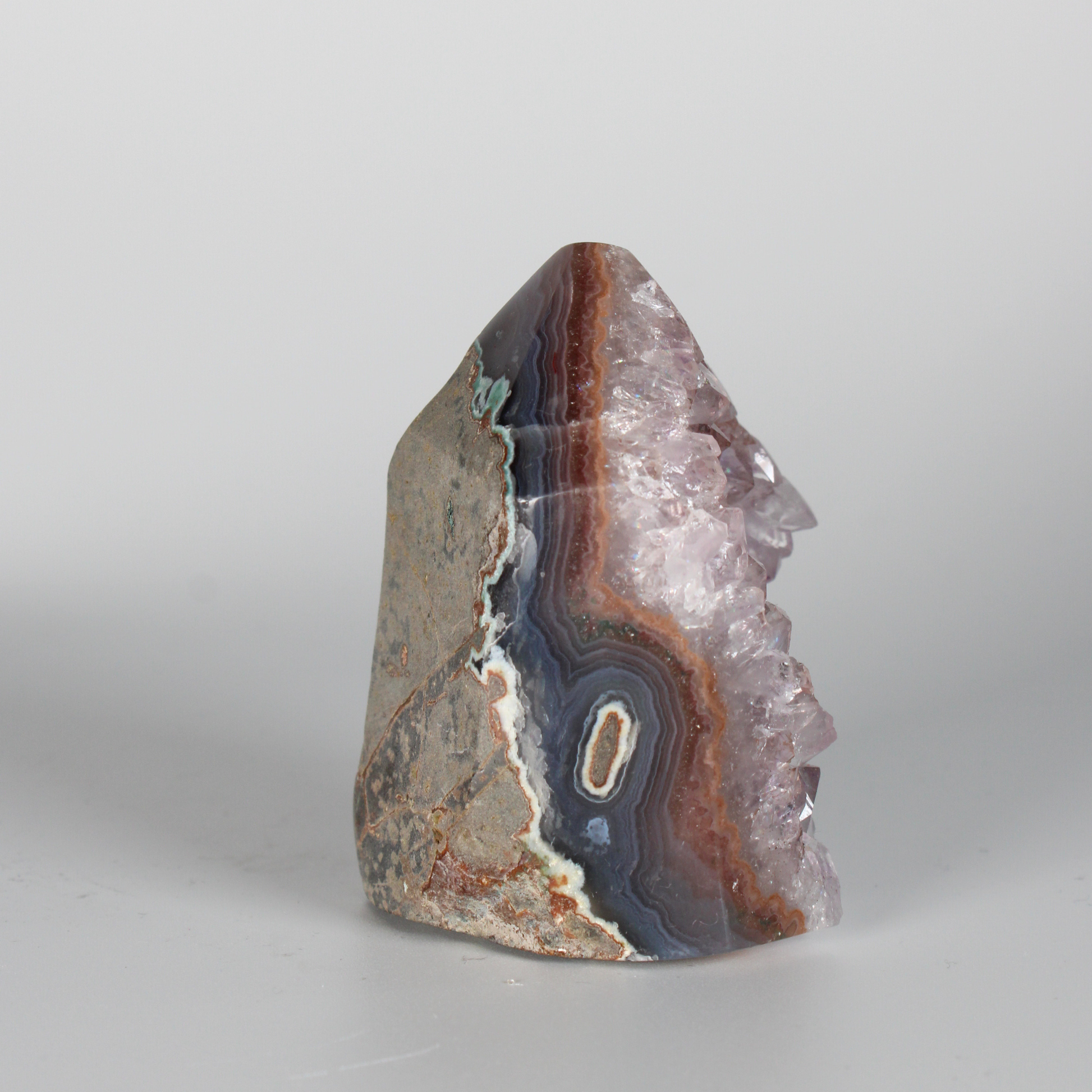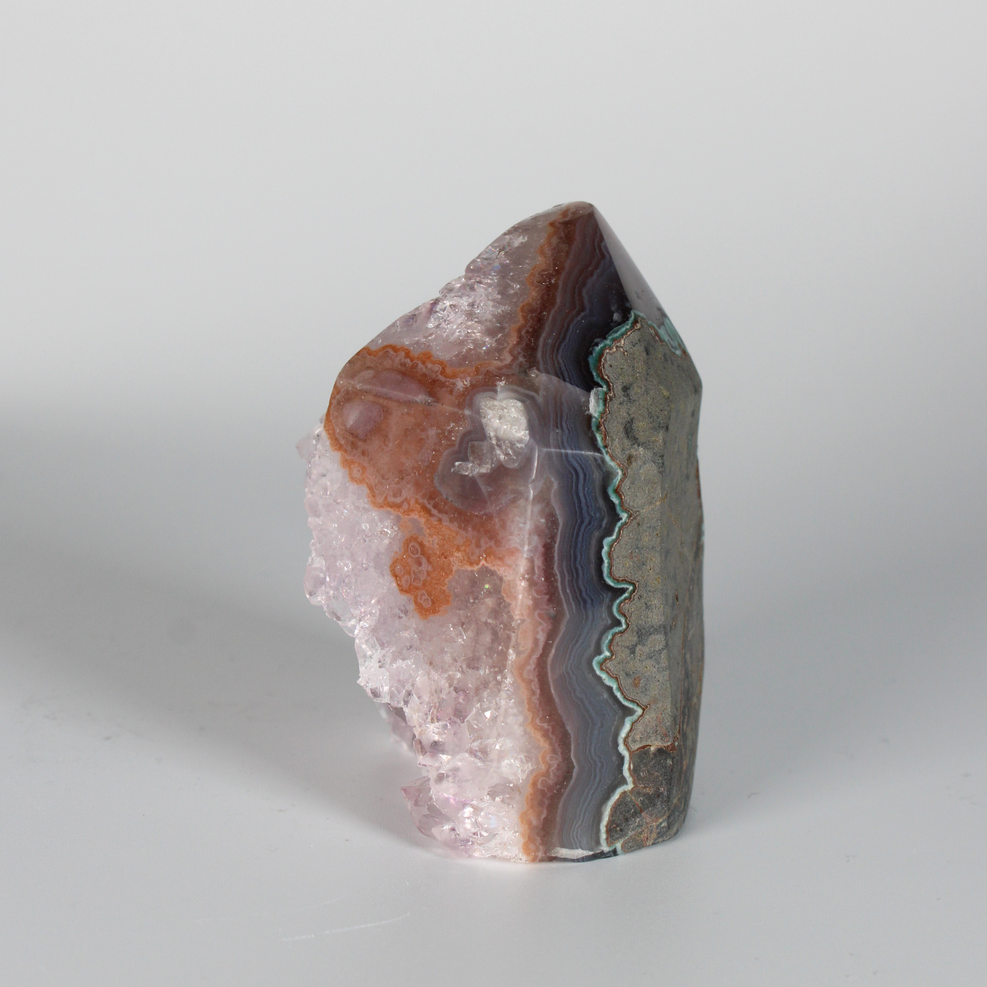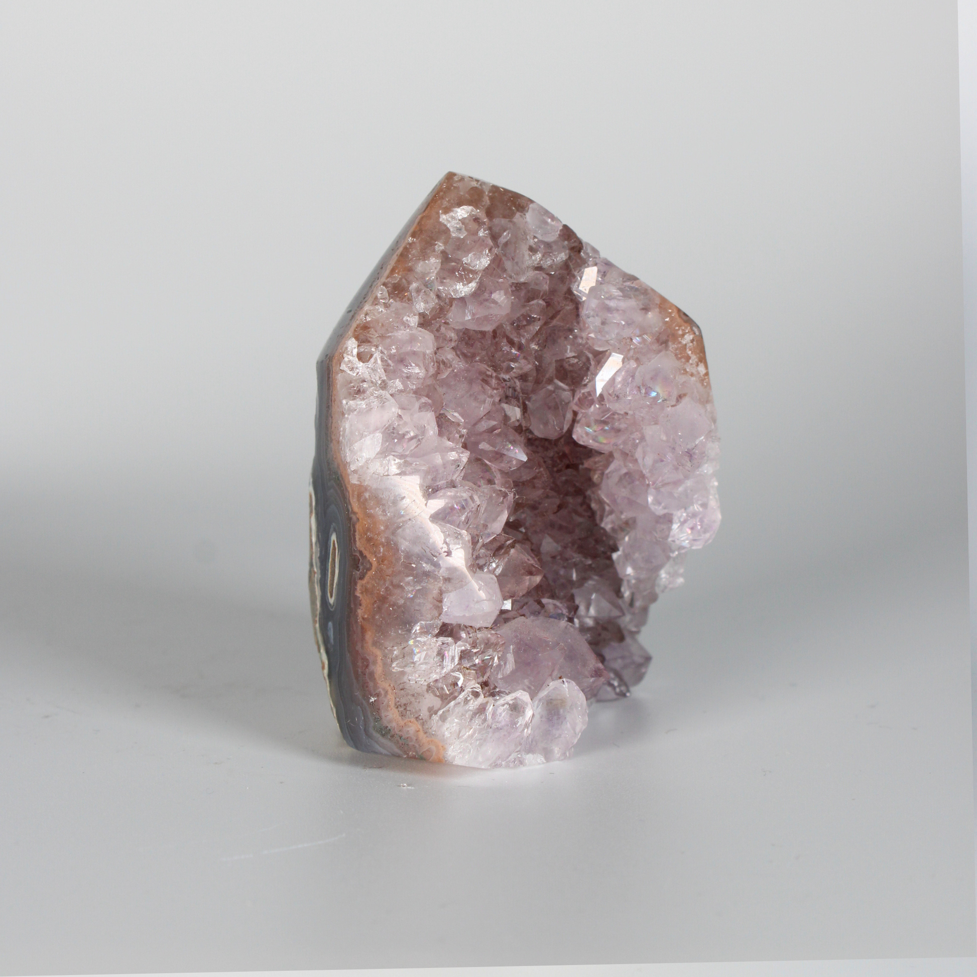 Deze betoverende Cluster Punt met Flower Amethist en Agaat Rand combineert zachte spirituele verfijning met aardende bescherming. De bloemachtige kristalformaties van Flower Amethist stralen een liefdevolle, kalmerende energie uit, terwijl de natuurlijke agaatrand zorgt voor stabiliteit, bescherming en een gevoel van veiligheid.