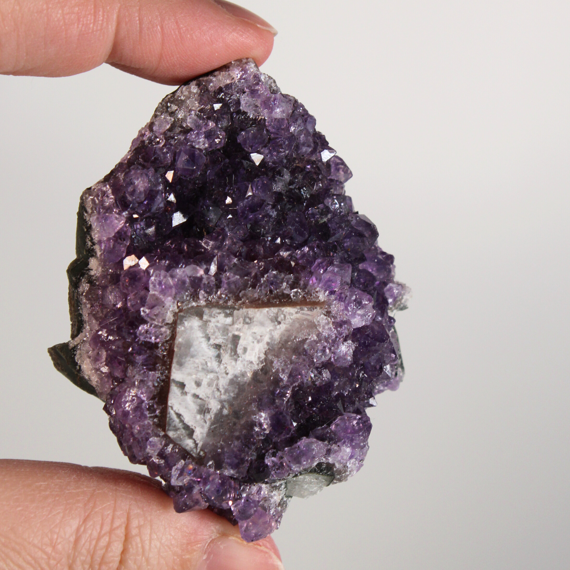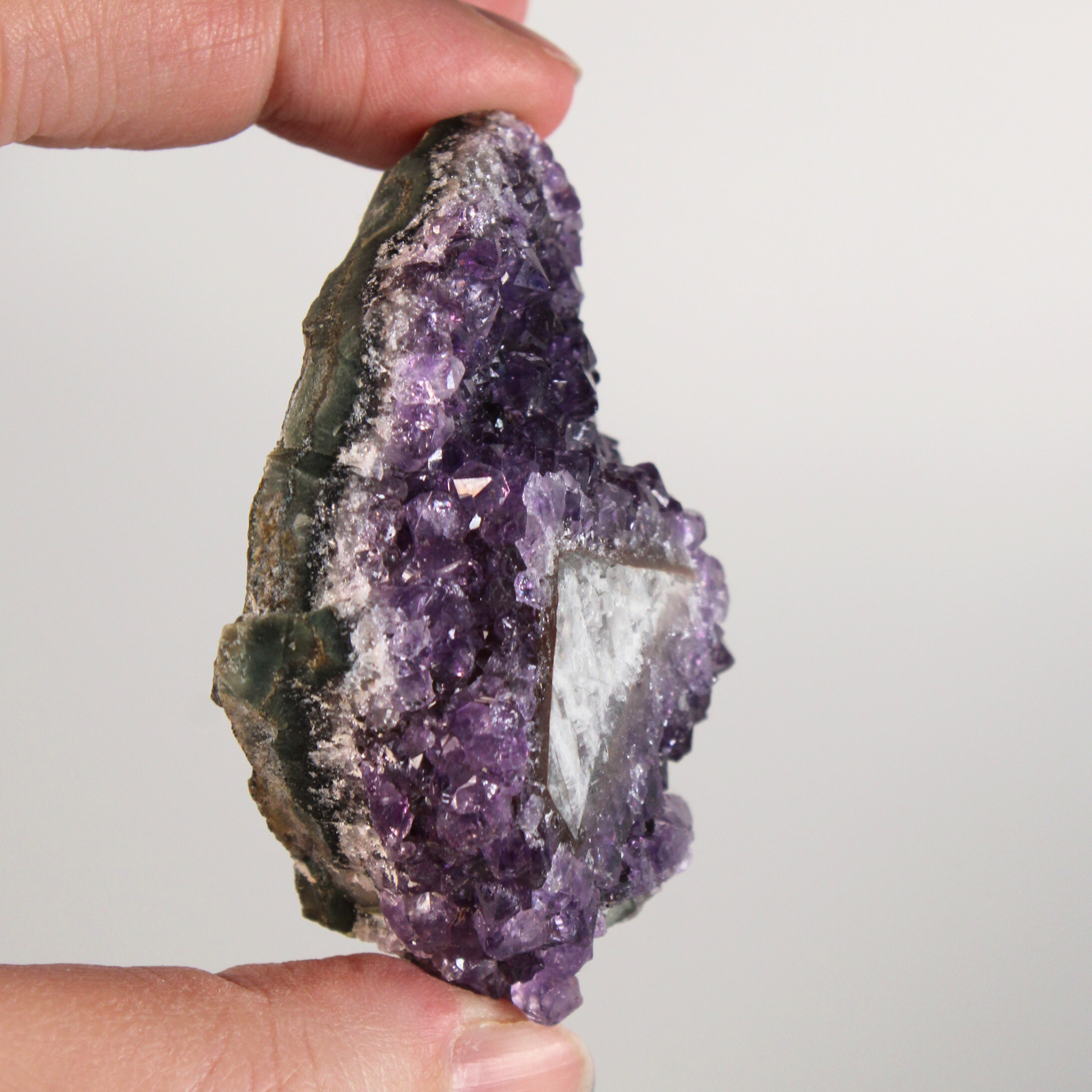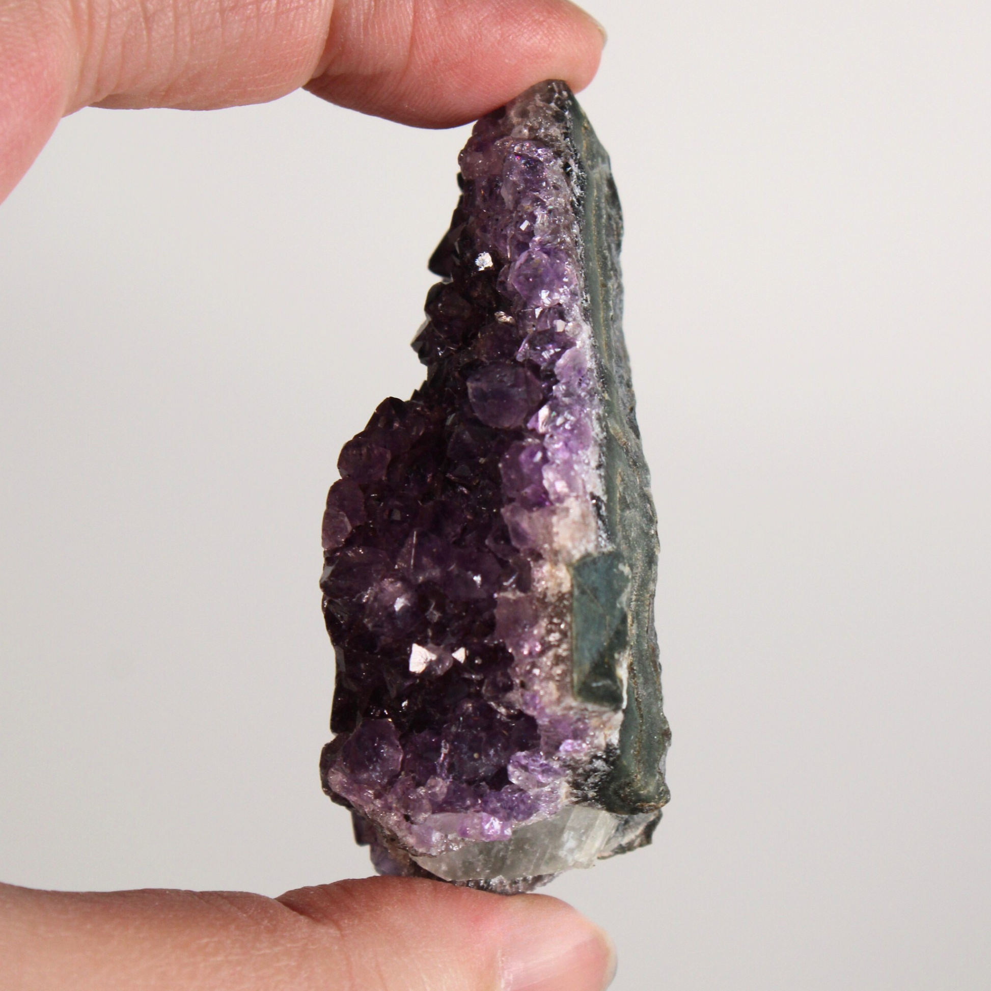 Deze amethist nodigt uit tot innerlijke stilte en vertrouwen, helpt bij het kalmeren van een overactieve geest en ondersteunt bij het doorbreken van oude patronen. Tegelijkertijd creëert hij een beschermend veld dat negatieve invloeden verzacht en je helpt stevig in je eigen energie te blijven staan.