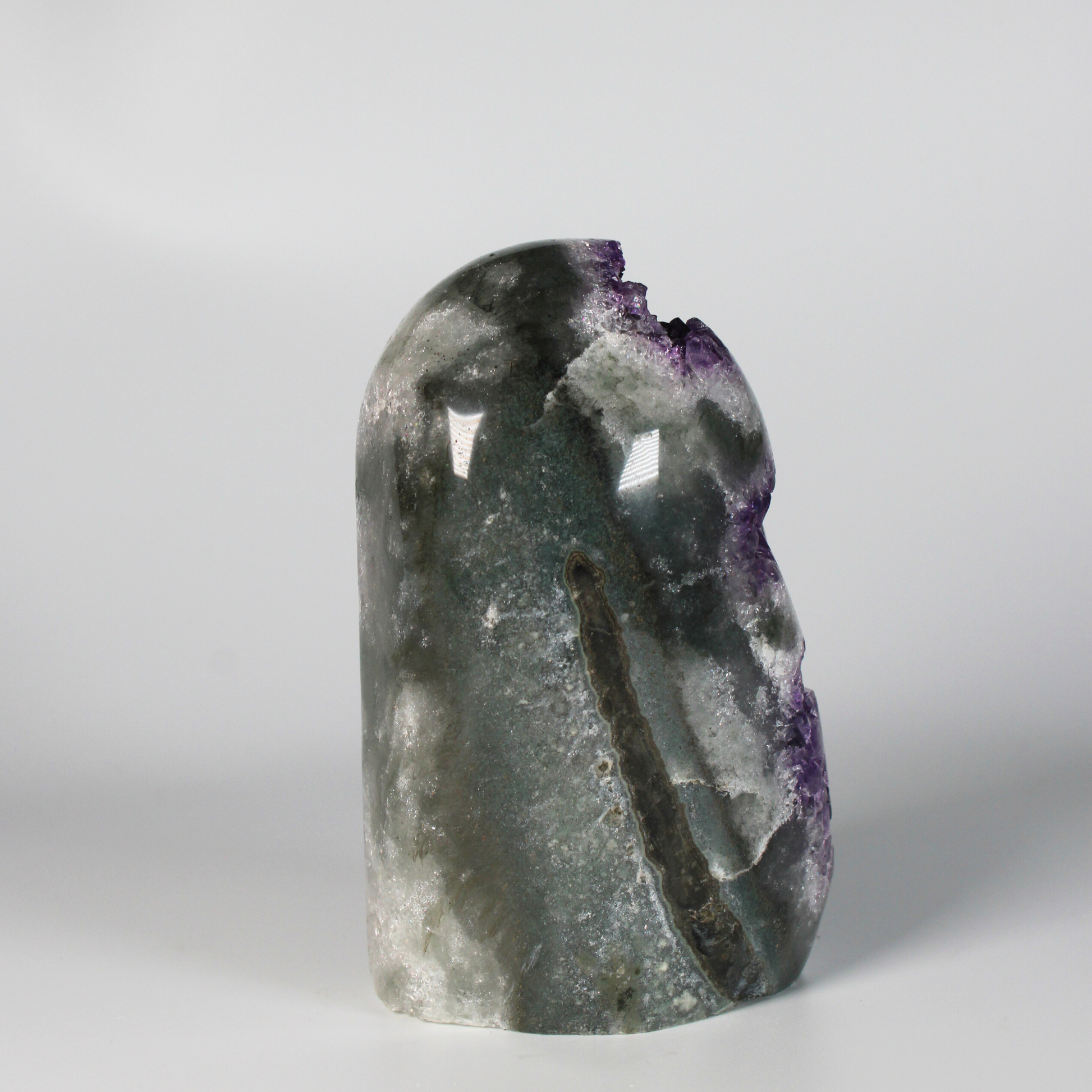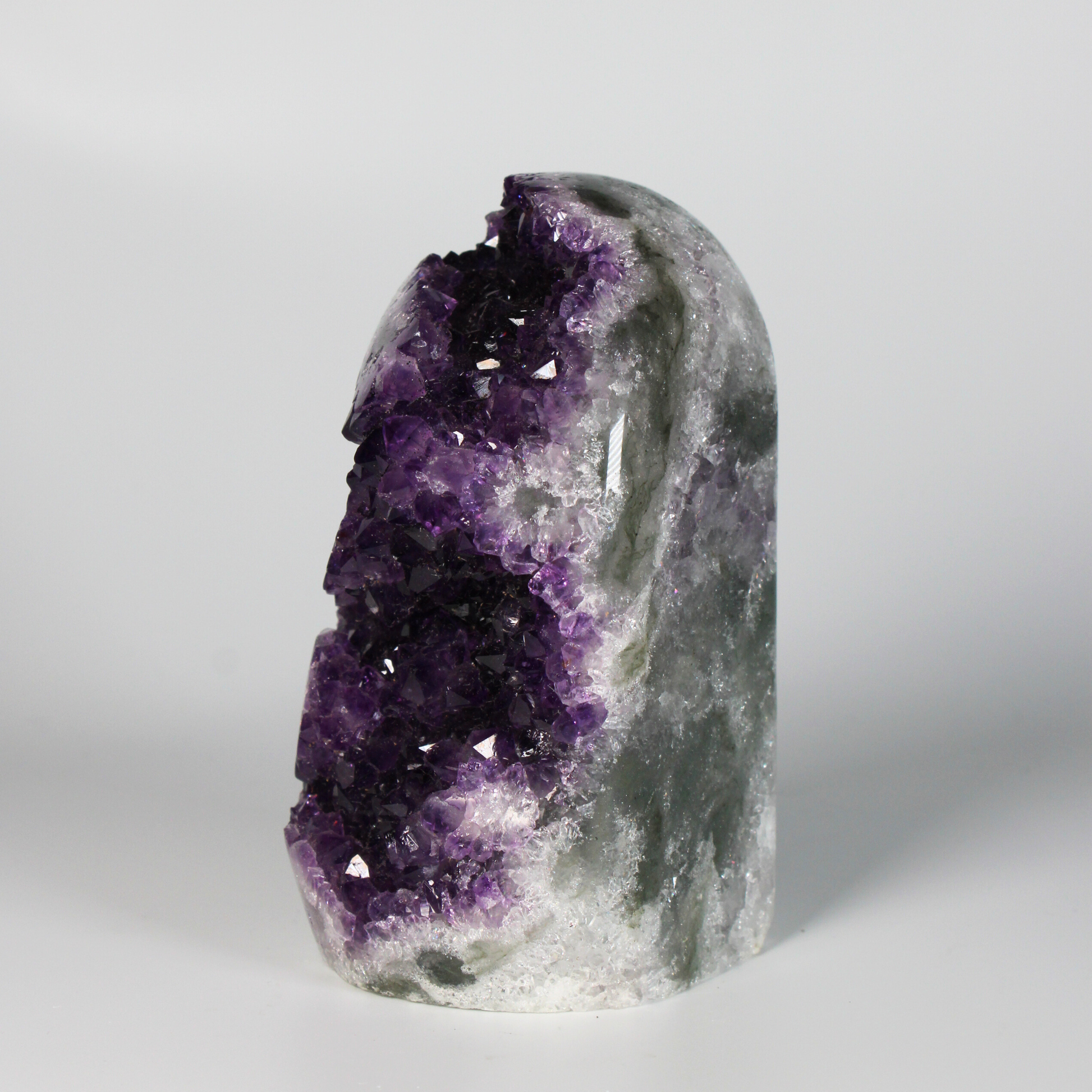 Dankzij het standvlak is deze amethist perfect om neer te zetten in een woonruimte, praktijkruimte of meditatieplek. Hij zuivert de energie van de ruimte, beschermt tegen negatieve invloeden en draagt bij aan een serene, harmonieuze sfeer.