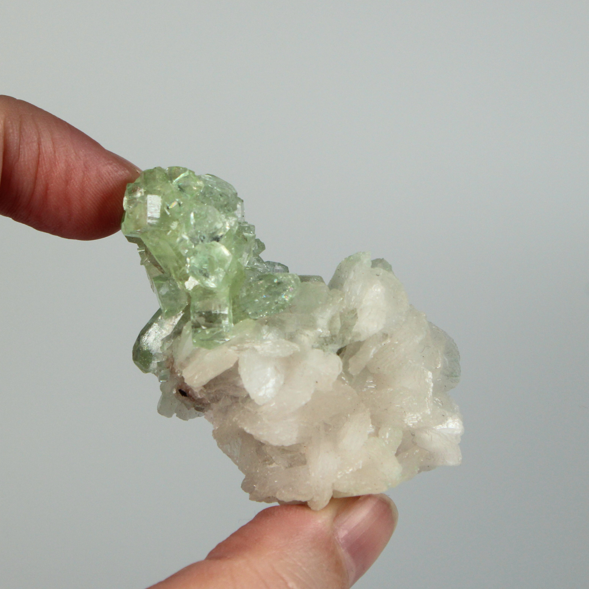 Apofyliet werkt sterk op het kruinchakra en het derde oog en ondersteunt bij spirituele inzichten, helderheid en het openen van hogere bewustzijnslagen. Stilbiet voegt hier een kalmerende, aardende en hartgerichte energie aan toe, waardoor deze combinatie helpt om spirituele informatie zacht te integreren in het dagelijks leven. Samen creëren zij een veilige ruimte voor meditatie, innerlijk werk en energetische healing.