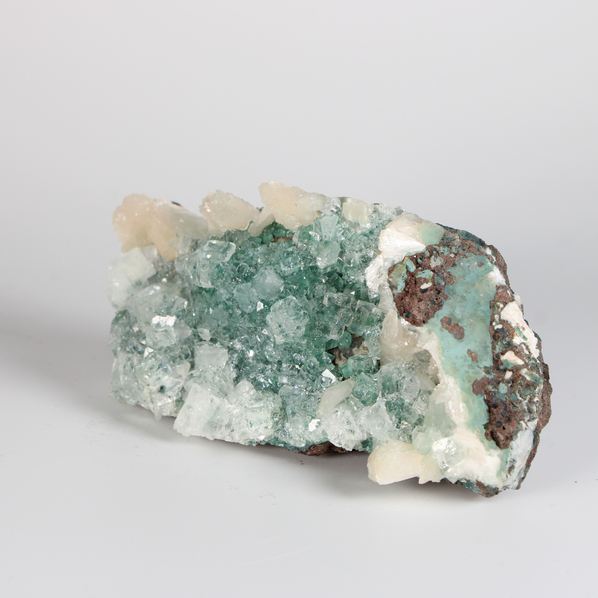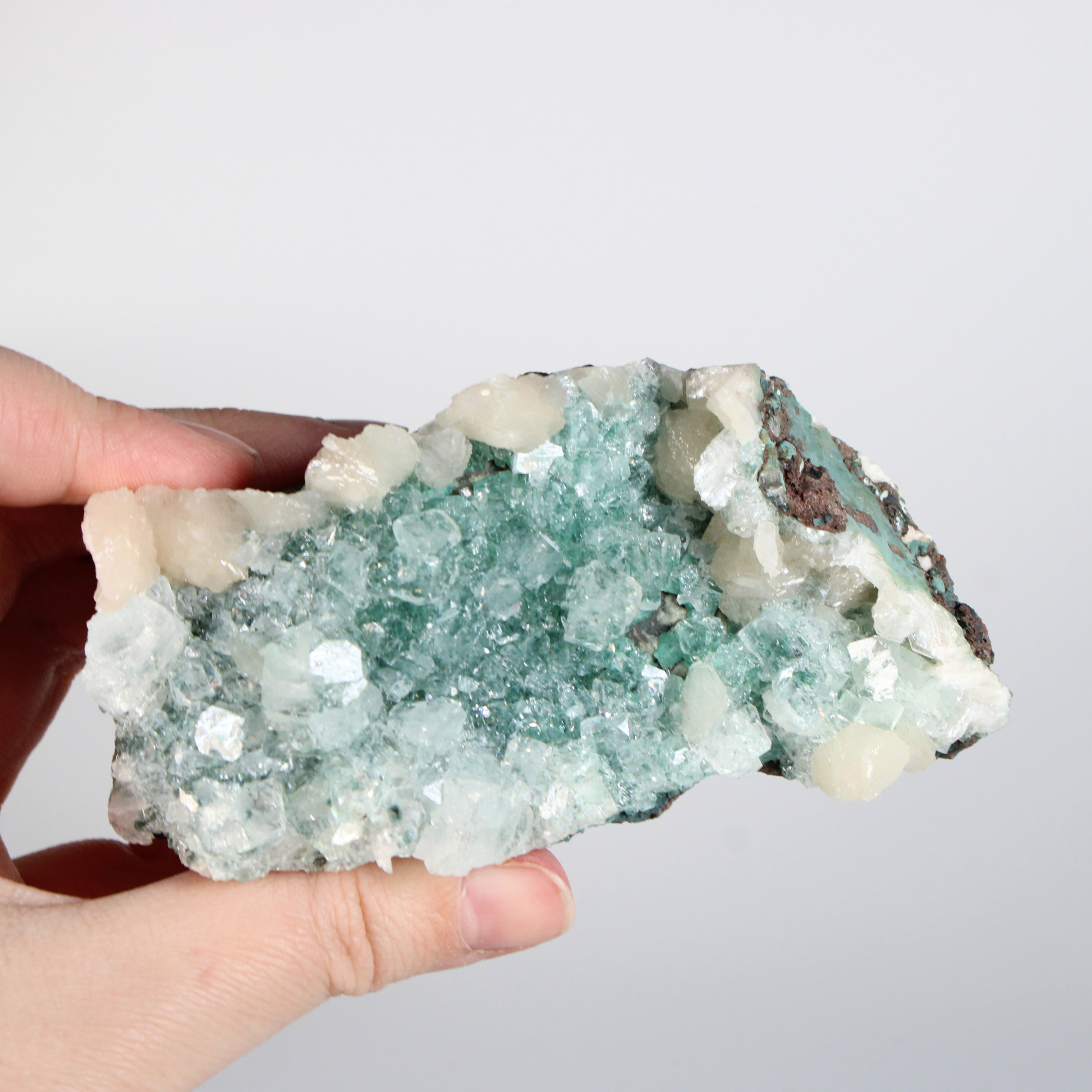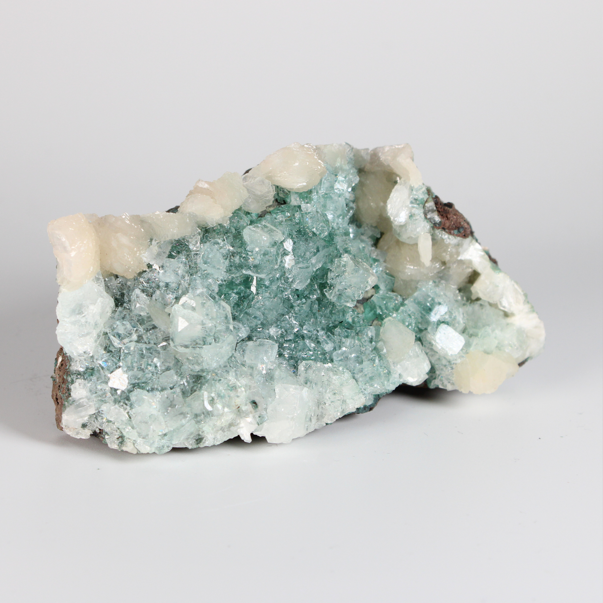 Deze bijzondere Apofyliet met Stilbiet van extra kwaliteit (AAA) verenigt twee krachtige, maar zachte kristalenergieën in één harmonieus geheel. De heldere, lichtreflecterende Apofyliet kristallen worden liefdevol omarmd door de zachte, vaak perzik- of roomkleurige Stilbiet, wat zorgt voor een diepe trilling van rust, bewustzijn en hartverbinding.
