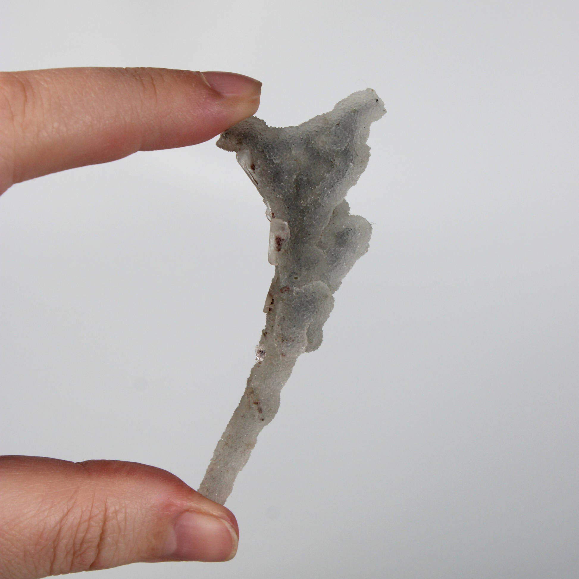 Deze chalcedoon stalactiet is afkomstig uit Maharashtra, India, een regio die bekendstaat om haar hoogwaardige en karaktervolle chalcedoonformaties.