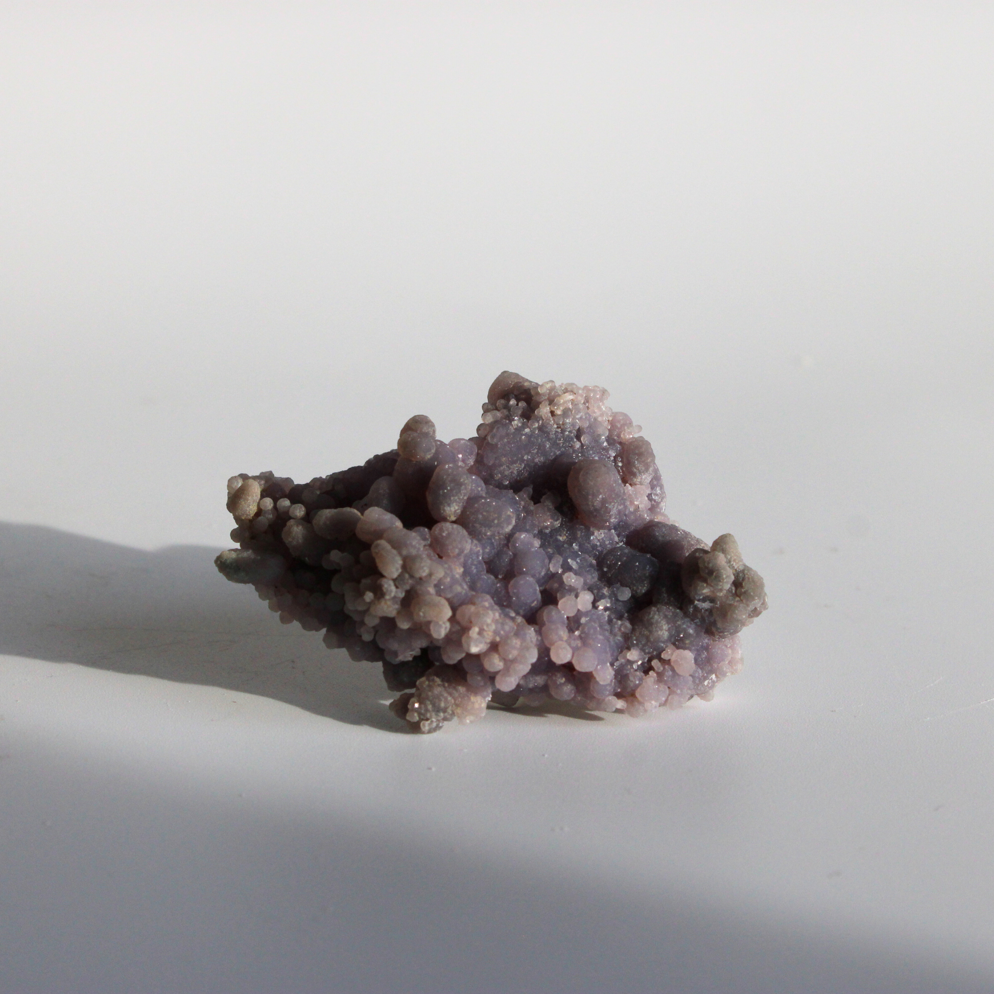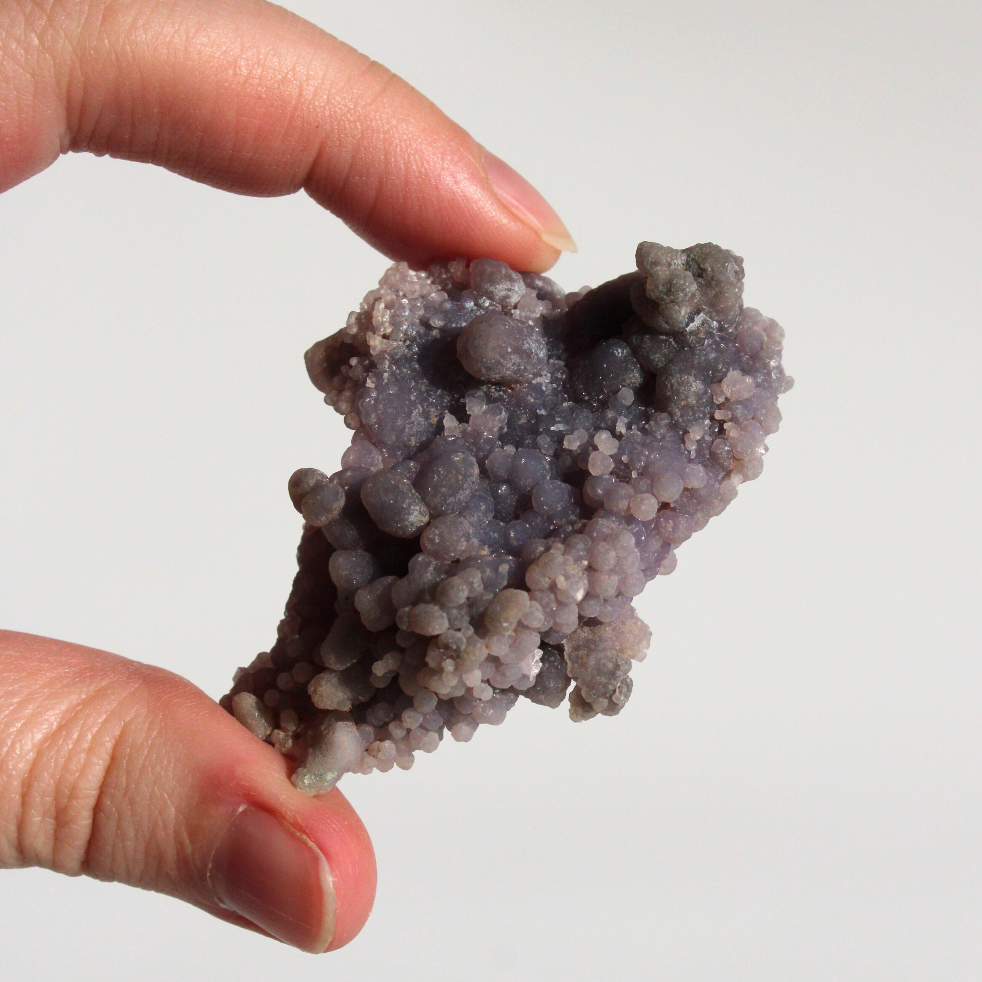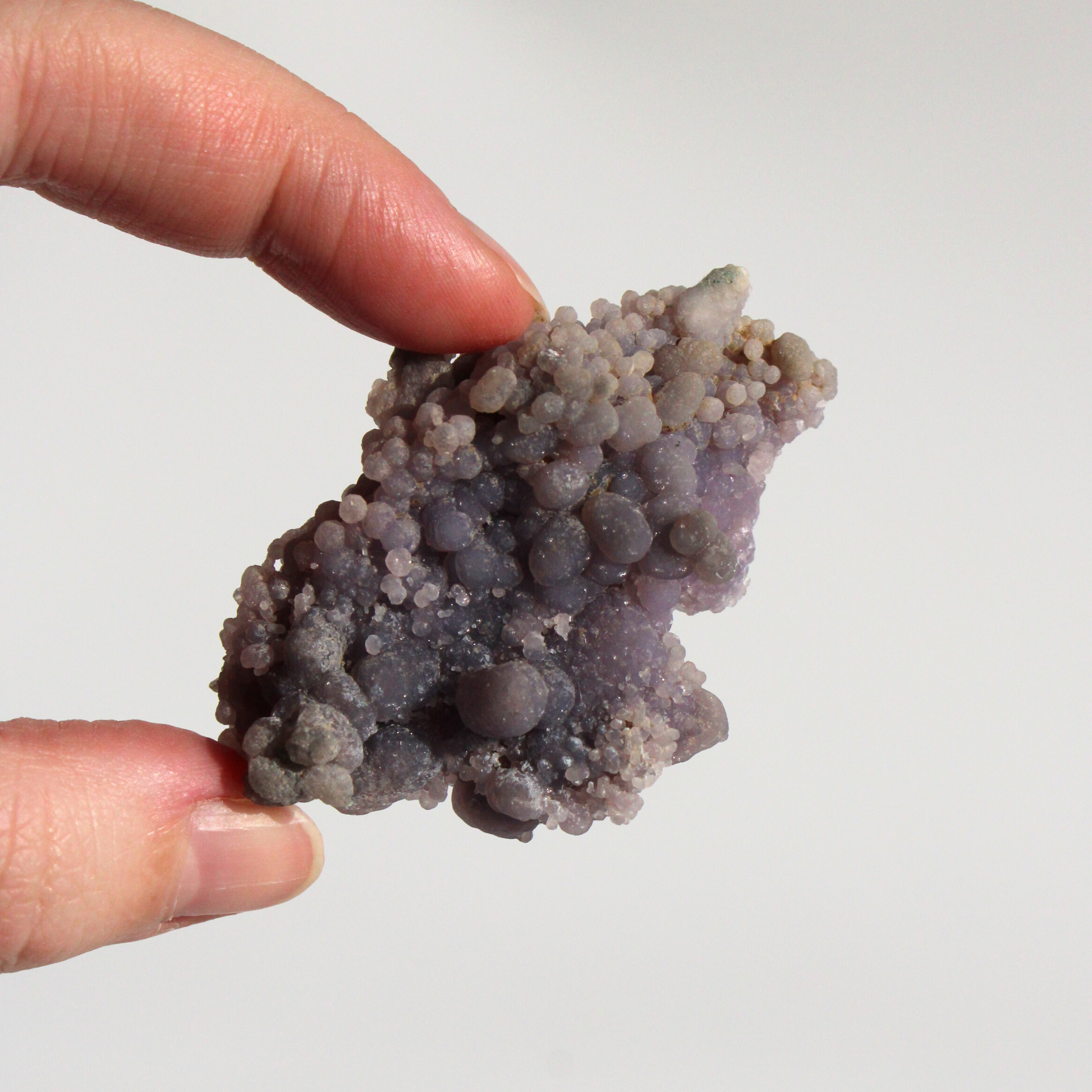 Druifagaat ontstaat door de langzame afzetting van microscopisch kleine kwartsdeeltjes, die zich in ronde vormen opbouwen. Dit natuurlijke groeiproces zorgt voor de kenmerkende bolletjesstructuur en maakt elk stuk uniek in vorm, kleur en uitstraling.