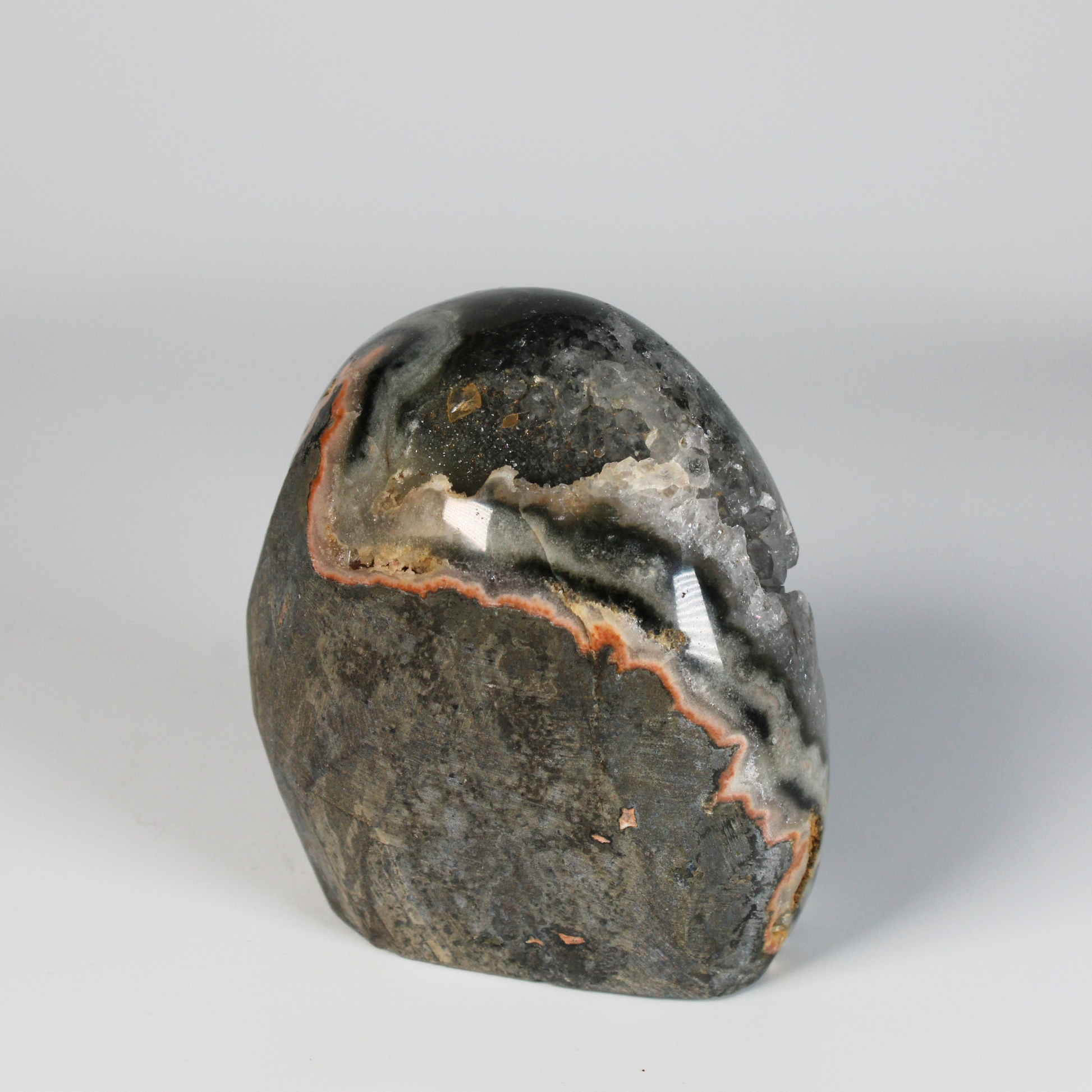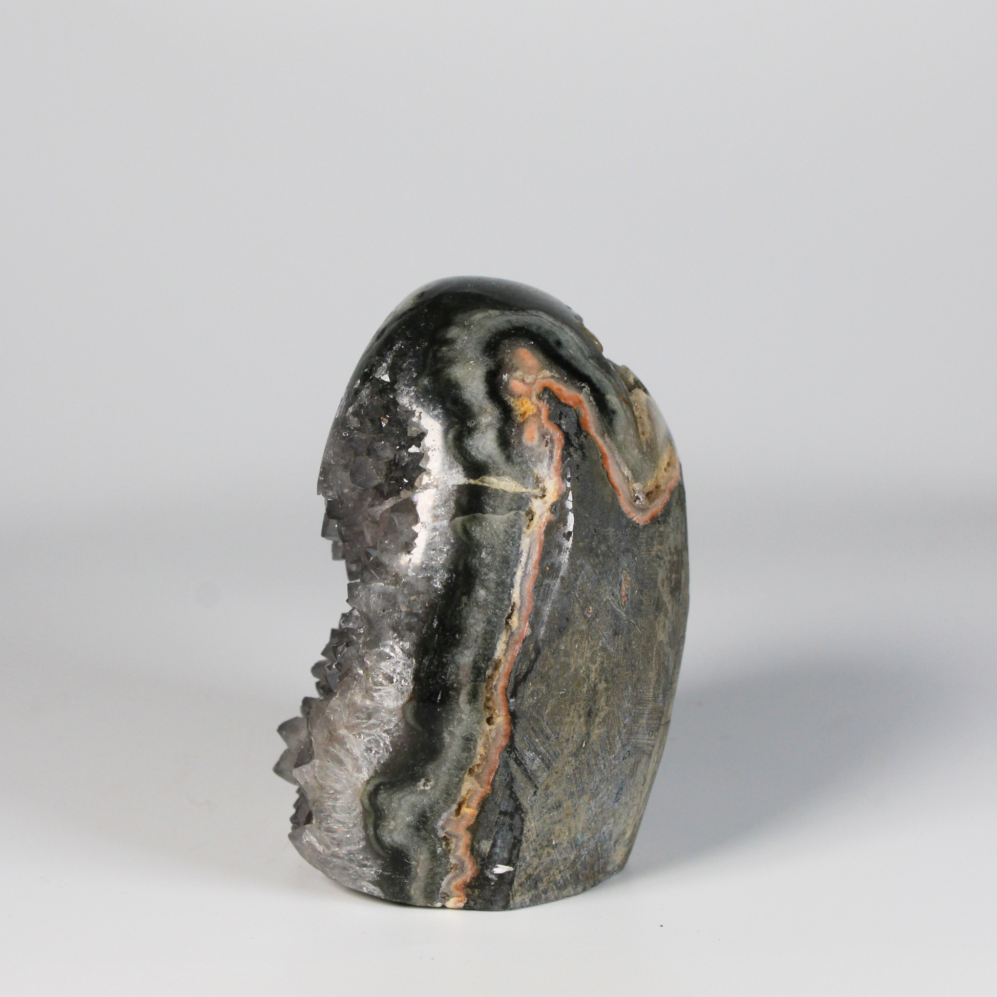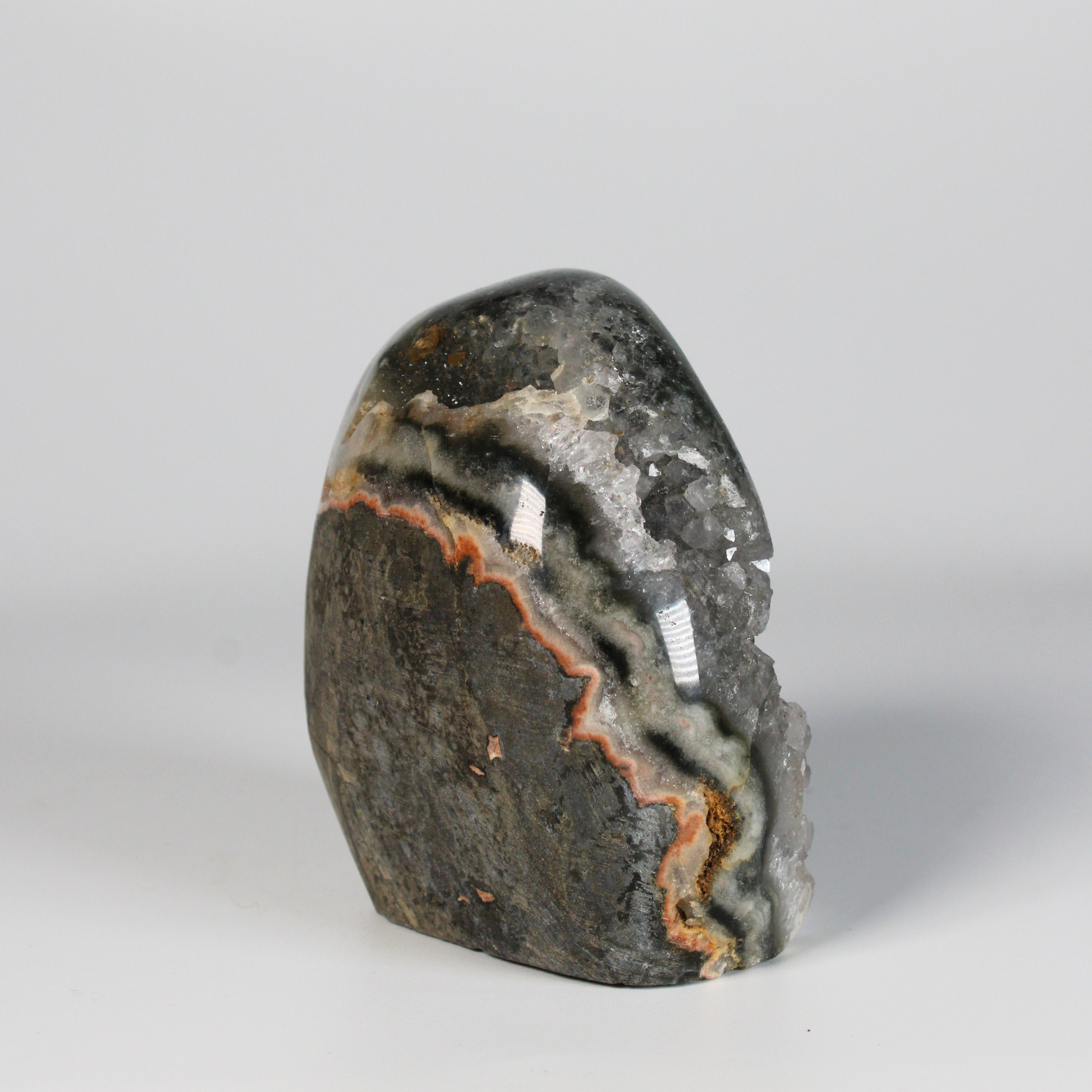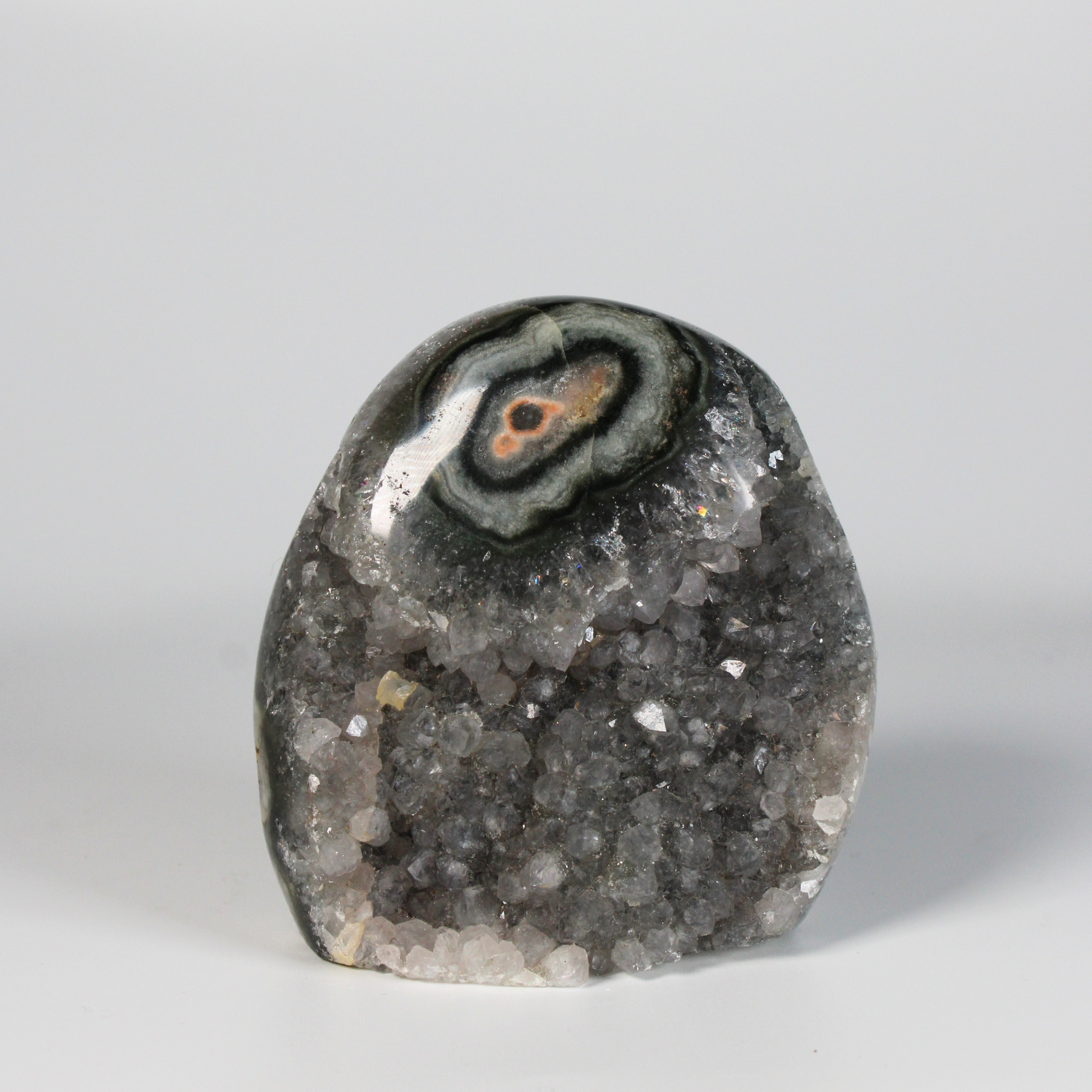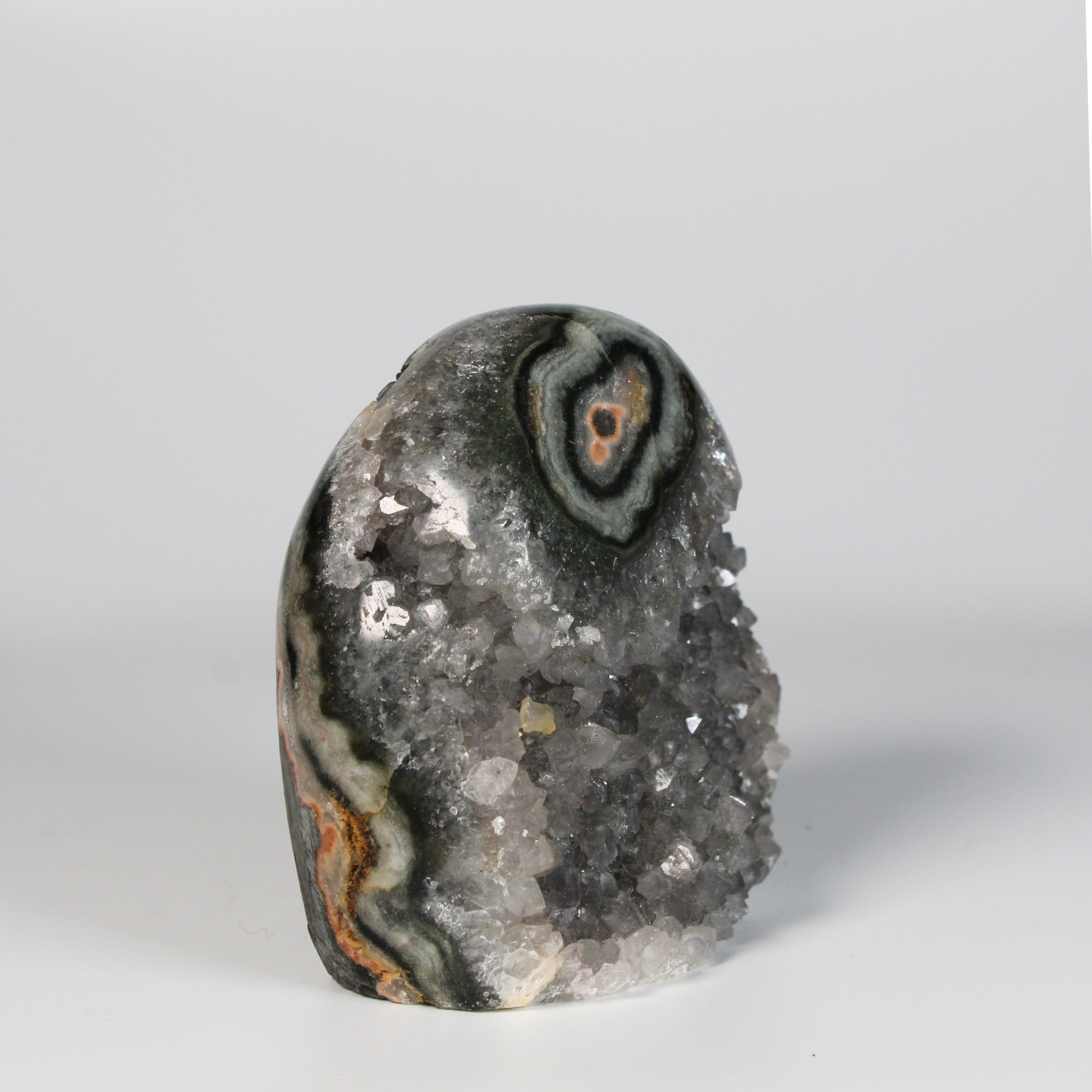 Dankzij het standvlak is deze steen ideaal om neer te zetten in een woonruimte, praktijk of meditatieplek, waar hij continu een kalme, beschermende en harmoniserende energie verspreidt. De unieke combinatie van grijze amethist, agaat en stalactiet maakt elk stuk volledig uniek.